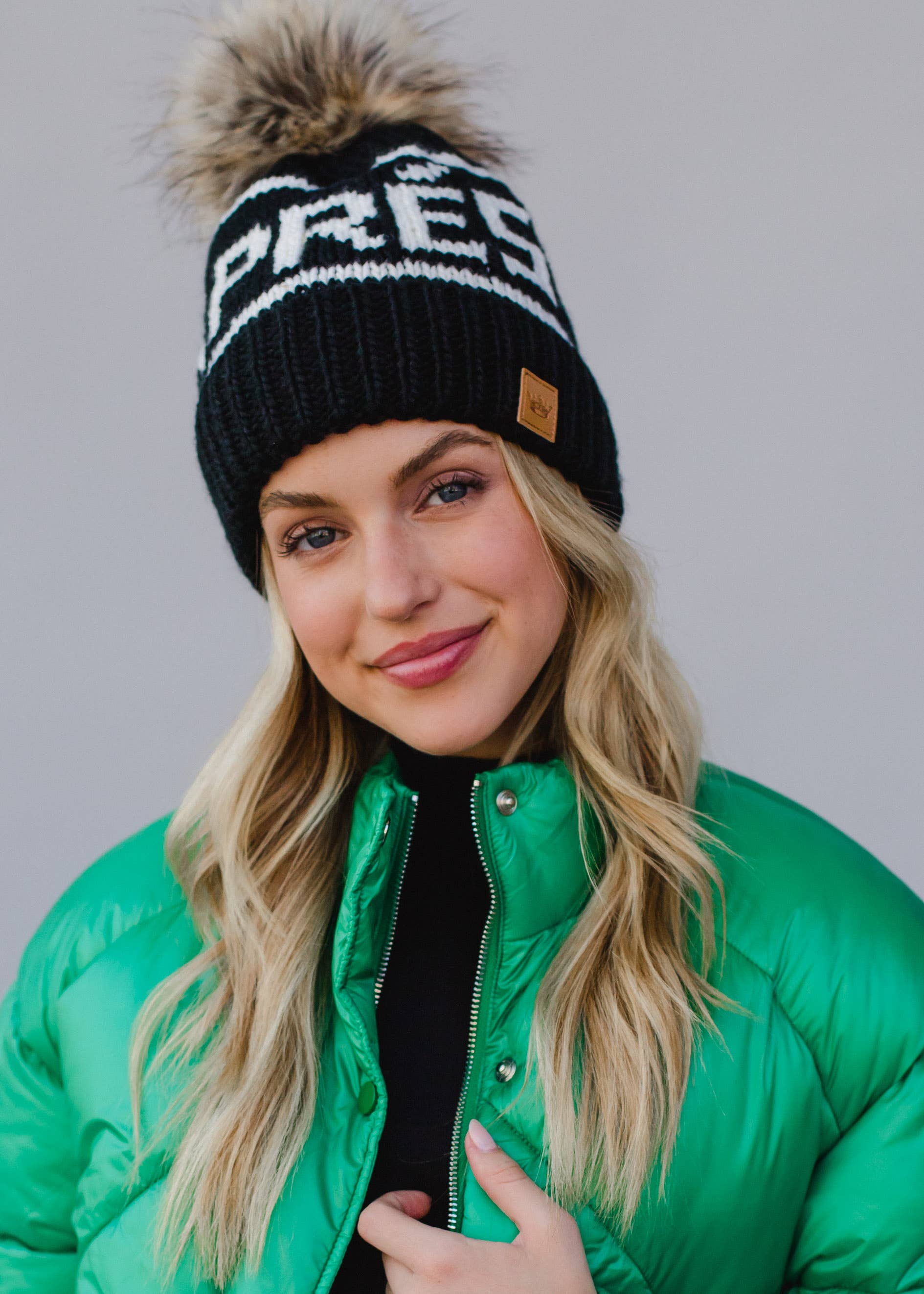 Natural faux fur pom accent Fleece lined 100% Acrylic