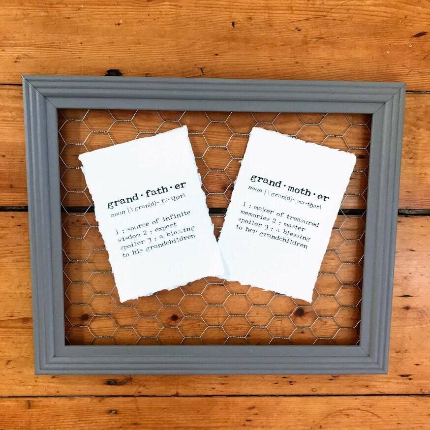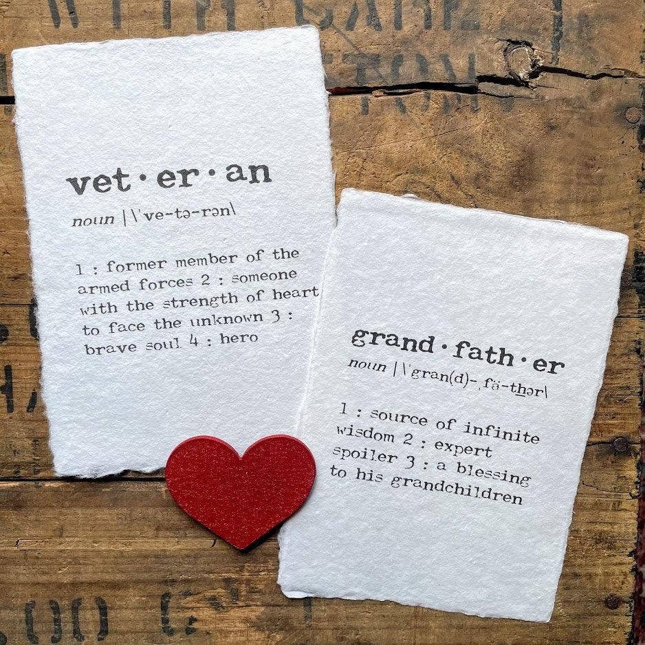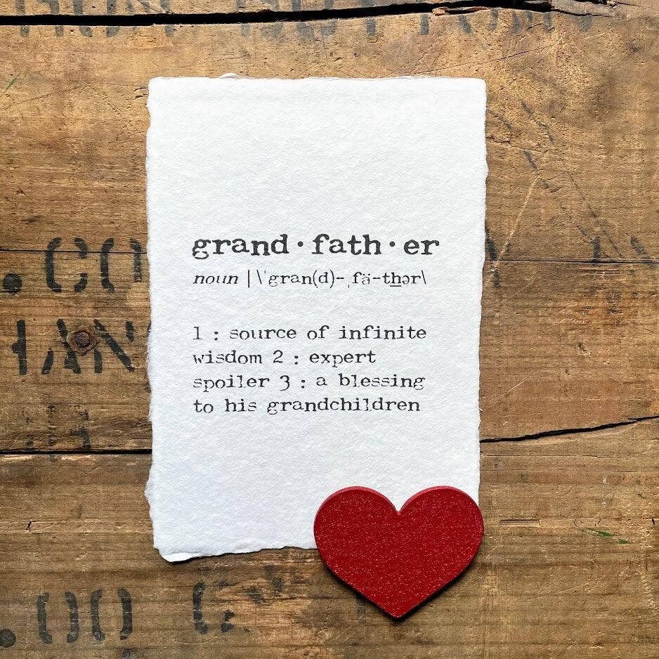 grandfather definition print on handmade cotton rag paper. Do you adore your Grandpa? He's the source of infinite wisdom, an expert spoiler, and a blessing to his grandchildren. Show him how much you or his grandchildren love him with this grandfather definition print. The words are printed in a typewriter font on handmade cotton rag paper. The color of the paper is a natural, unbleached white but may occasionally have tiny speckles of random color from other fibers mixed in. Size varies slightly because of the imperfect nature of handmade paper, but will be roughly 5" x 7"