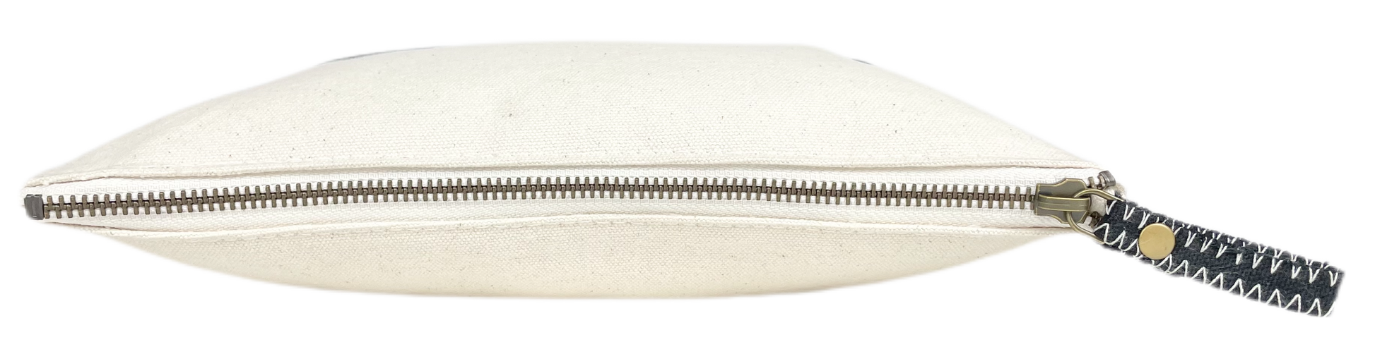 Accessories pouch made from eco-friendly 16 oz cotton canvas. Made in India using sustainable cloth material, materials, this pouch measures 11W x 7H x 3D inch. Featuring a robust metal zipper with a convenient pull tab and a hook for key fobs, it combines durability with style.