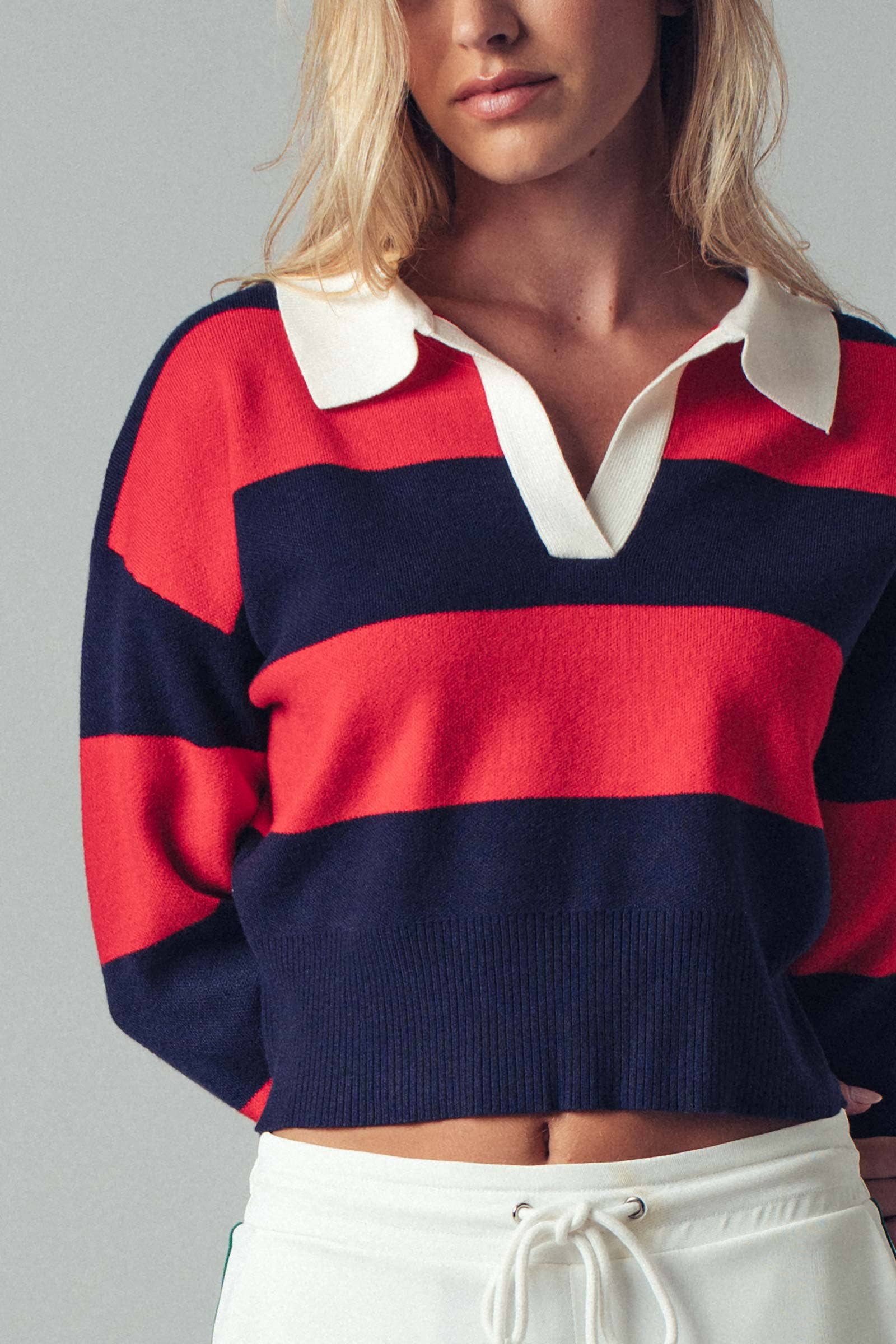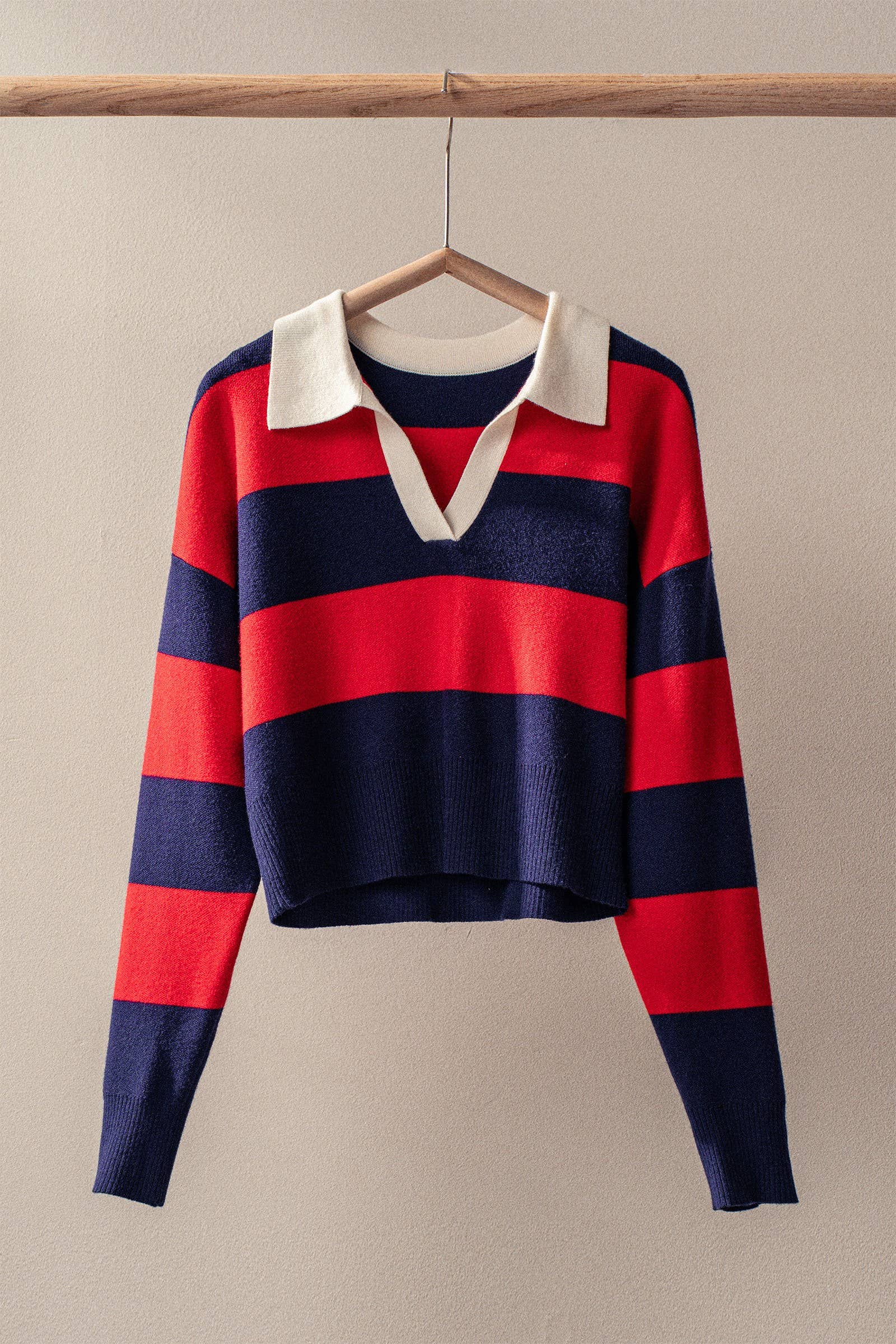 Step up your game day or casual wardrobe with this bold striped knit top. Featuring a contrast collar and cropped silhouette, it blends sporty and polished in one effortlessly cool piece.